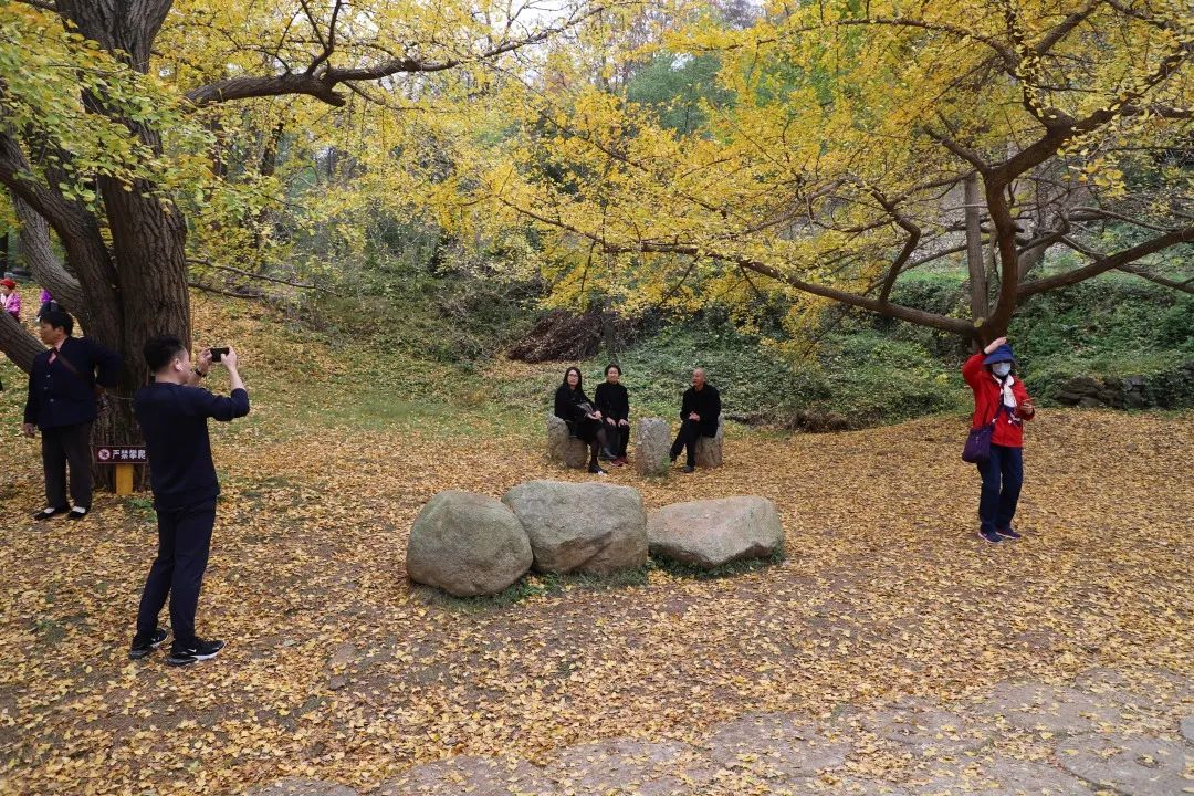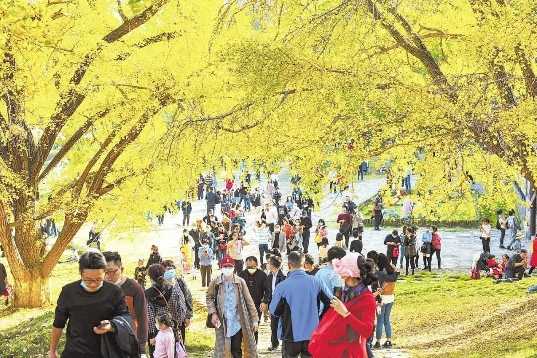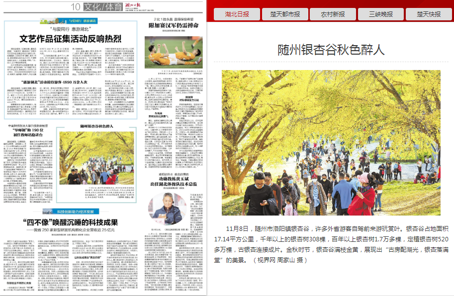 11月8日,随州市洛阳镇银杏谷,许多外省游客自驾前来游玩赏叶。银杏谷占地面积17.14平方公里,千年以上的银杏树308棵,百年以上银杏树1.7万多棵,定植银杏树520多万棵,古银杏连接成片。金秋时节,银杏谷满枝金黄,展现出“古房配湖光,银杏落满堂”的美景。