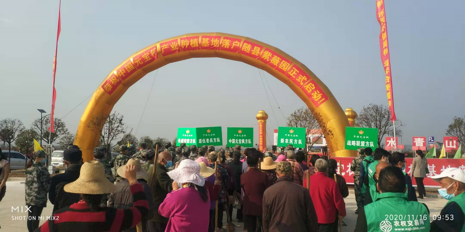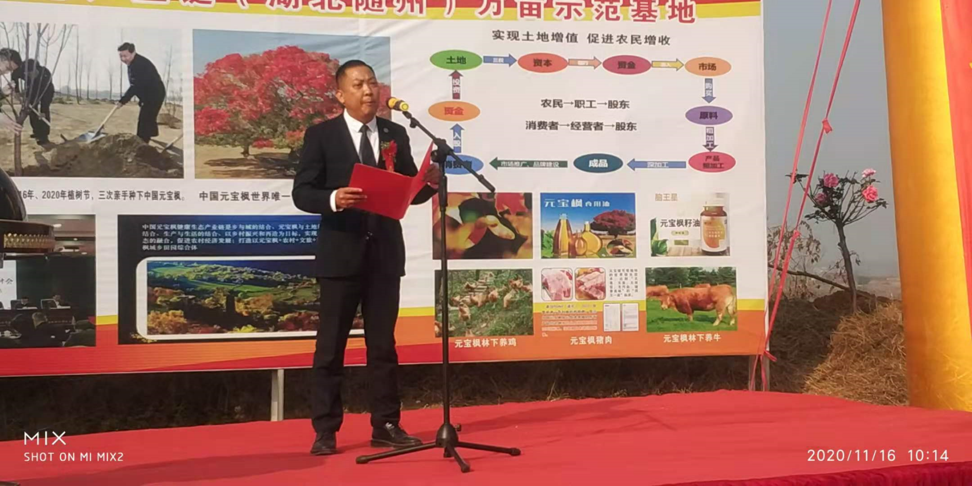 11月16日,由春雨蒽林(北京)生物科技有限公司、随州炎帝故里生态农业农民专业合作社、随州炎帝紫薇园旅游开发有限公司、湖北虎坚果公司共同举办的中国元宝枫产业种植基地项目落户启动仪式在随县炎帝紫薇园举行。