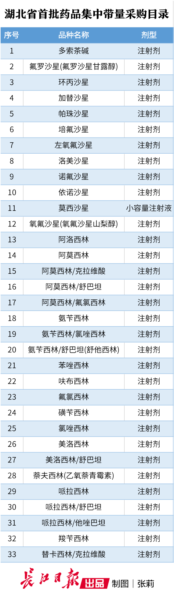 湖北省此次公布的首批药品集采目录,可谓“注射剂专场”;共涉及33个品种,主要为青霉素及喹诺酮类抗生素类,包括氟氧沙星、环丙沙星、阿莫西林、替卡西林等,均为常见注射剂大品种。