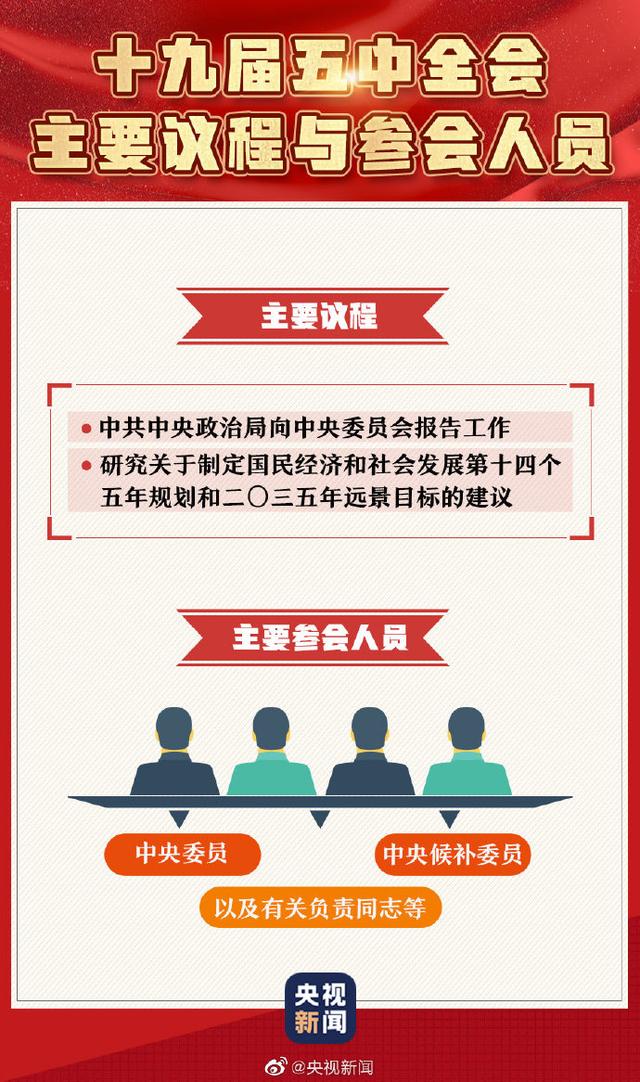 中国共产党第十九届中央委员会第五次全体会议,于10月26日至29日在北京举行。主要议程是,中共中央政治局向中央委员会报告工作,研究关于制定国民经济和社会发展第十四个五年规划和二〇三五年远景目标的建议。今天,一组图带你了解十九届五中全会↓↓收藏学习!