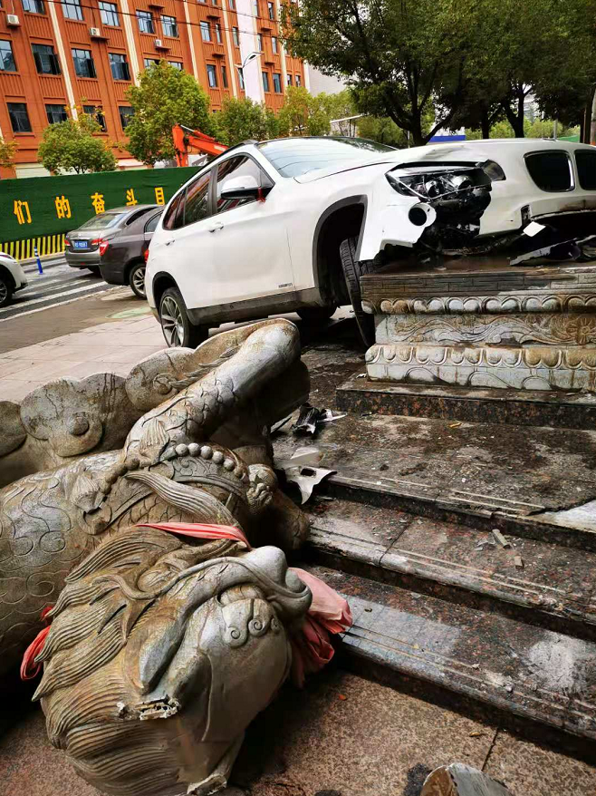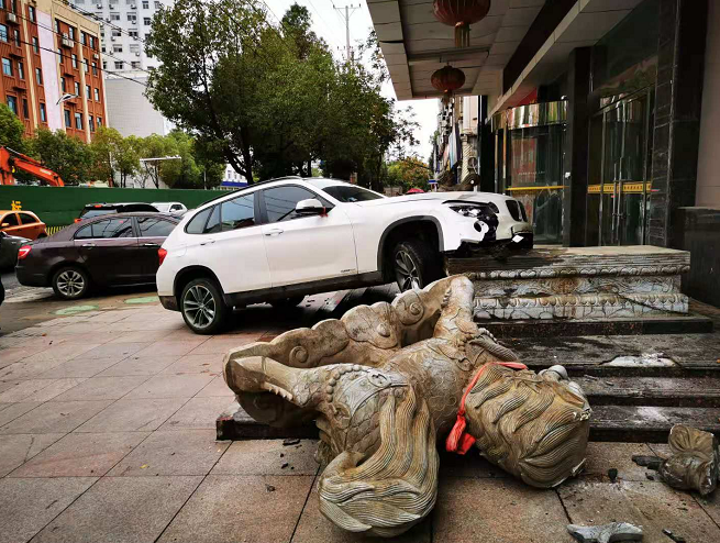 今早7点左右,在随州沿河大道左岸新城路段,一辆白色宝马车停车时,撞上了酒店门口的石狮子,车与石狮受损严重。