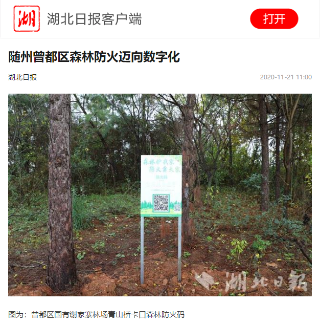 自2020年森林防火期起,曾都区全面推广使用森林防火码。目前,已在谢家寨林场各林区、千年银杏谷景区设置防火码标示,森林防火管理人员通过防火码掌握进山入林人员大数据,实现实时查询、分析、统计,有效加强野外火源管控,提升该区森林火灾综合防控能力。