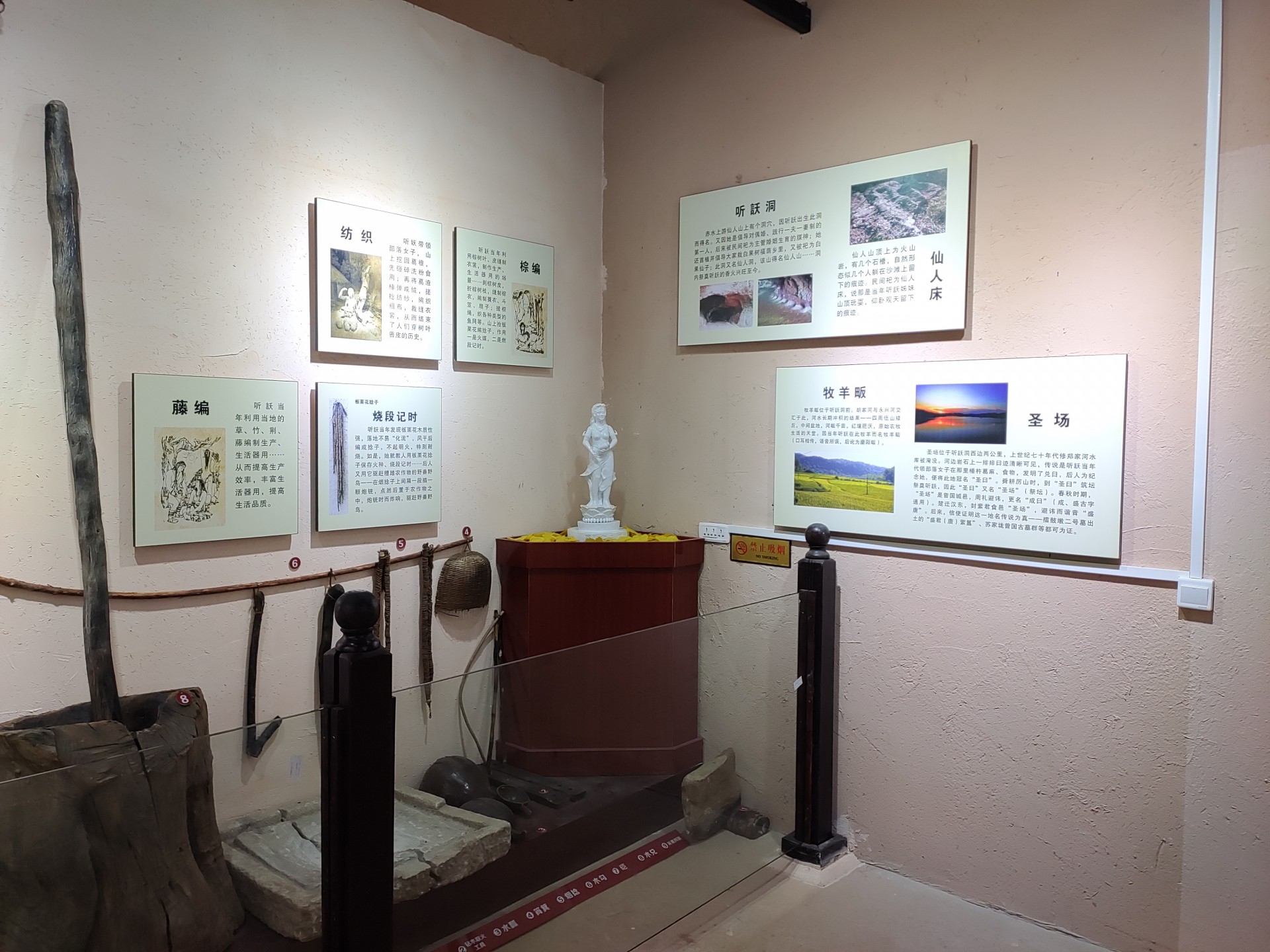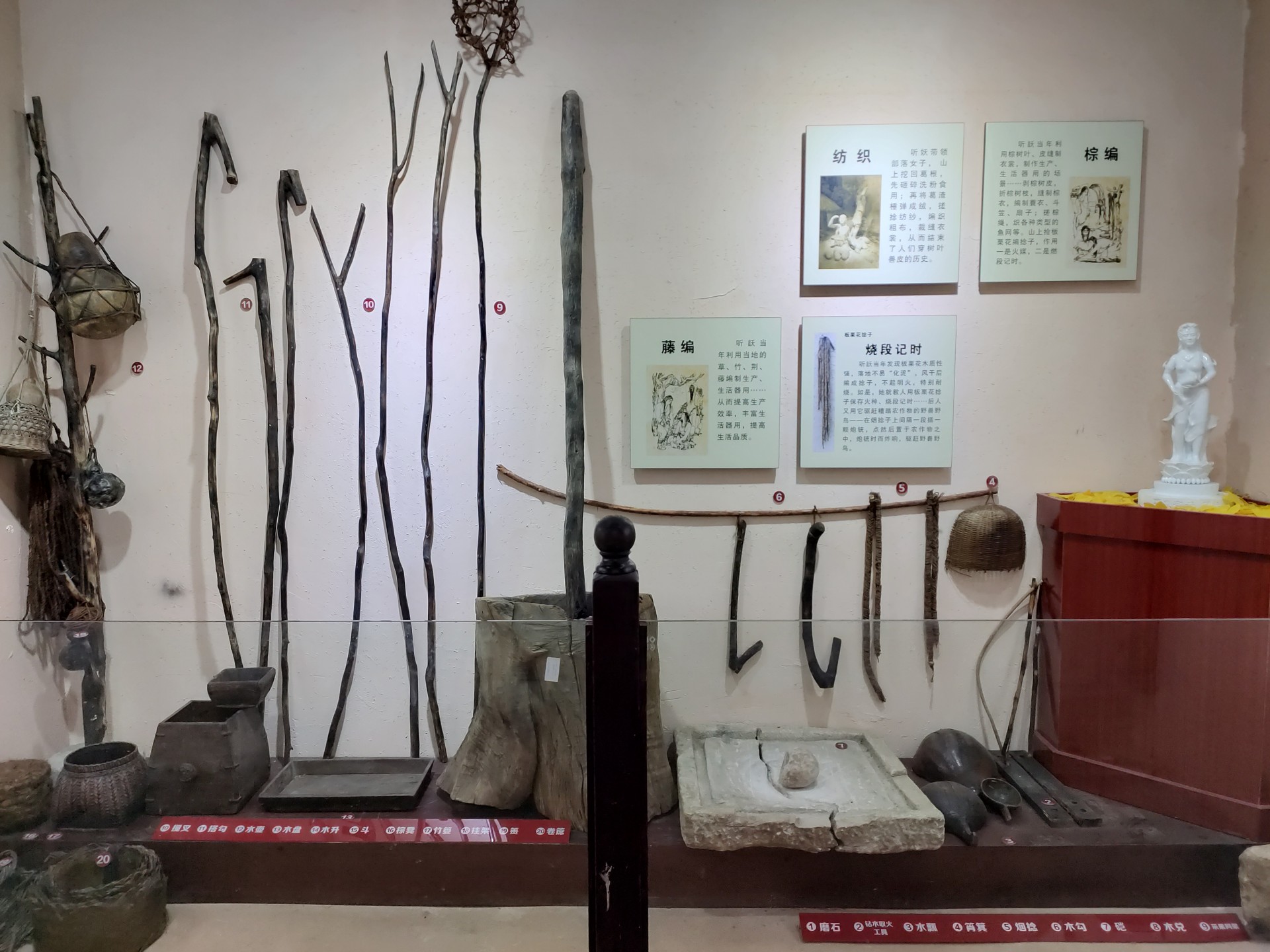 听訞带领部落女子, 山上挖回葛根,先砸碎洗粉食用;再将葛渣棰弹成绒,搓捻纺纱,编织粗布,裁缝衣裳,从而结束了人们穿树叶兽皮的历史。