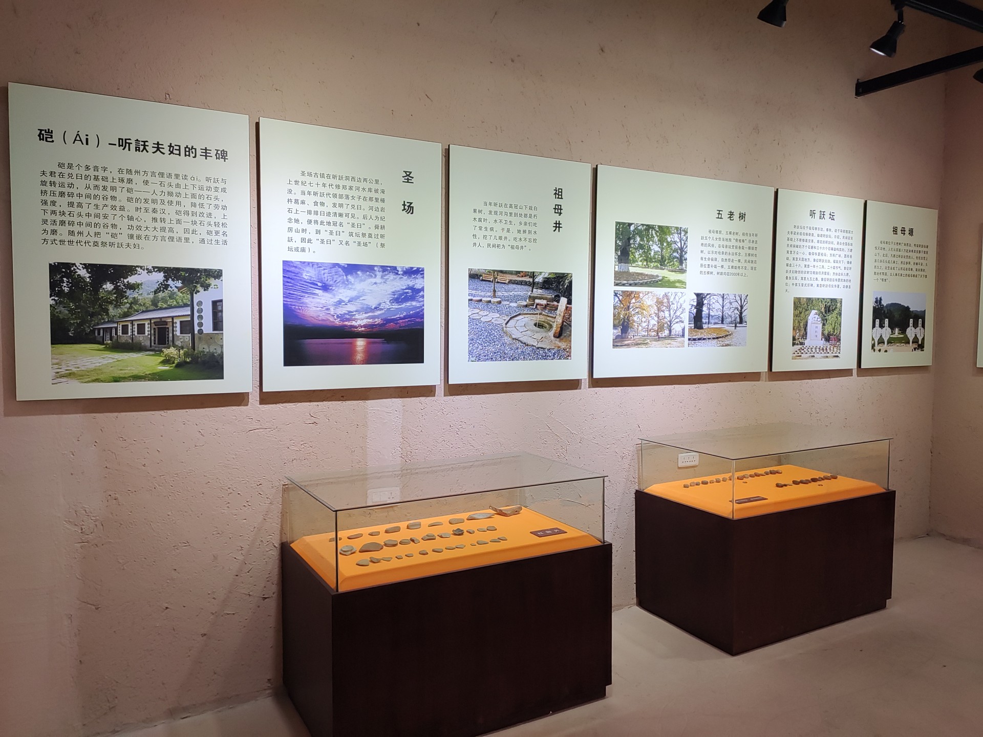 圣场位于听訞洞西边两公里,上世纪七十年代修郑家河水库被淹没。河边岩石上一排排臼迹清晰可见,传说是听訞当年代领部落女子在那里棰杵葛麻、食物,发明了兑臼,后人为纪念她,便将此地冠名“圣臼”。舜耕厉山时,到“圣臼”筑坛祭奠听訞,因此“圣臼”又名“圣场”(祭坛)。春秋时期,“圣场”是曾国城邑,周礼避讳,更名“成臼”(成、盛古字通用)。楚迁汉东,封萦君食邑“圣场”,避讳而谐音“盛唐”。后来,信使证明这一地名传说为真——擂鼓墩二号墓出土的“盛君(唐)萦簋”、苏家垅曾国古墓群等都可为证。