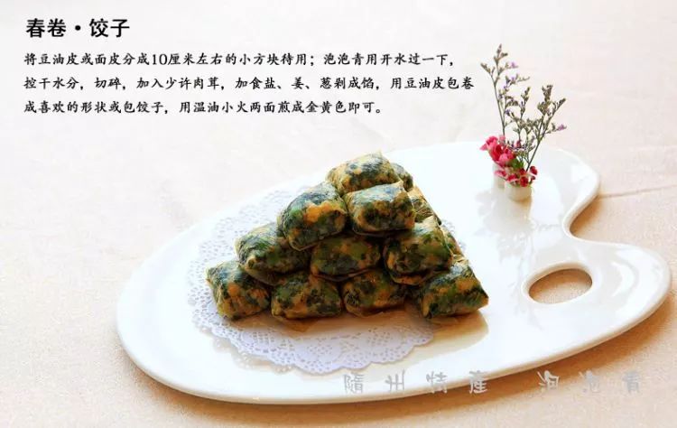 随州特色菜——随州人俗称“春饼”将豆油皮分成10厘米左右的小方块待用;泡泡青用开水过一下,控干水分,切碎,加入少许藕丁和肉茸,放入少量食盐、姜、葱揉成馅料,用豆油皮包卷成喜欢的形状,用温油小火两面煎成金黄色即可。