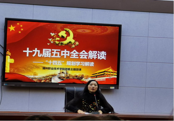为深入学习贯彻党的十九届五中全会精神,引导全校学生把思想和行动统一到全会精神上来,推动全会精神落地生根,共青团随州职业技术学院院团委组织各院系团支书和校学生会于2020年11月24号晚七点在云桂楼一楼学术报告厅开展以“学习贯彻党的十九届五中全会精神”为主题的团日活动。