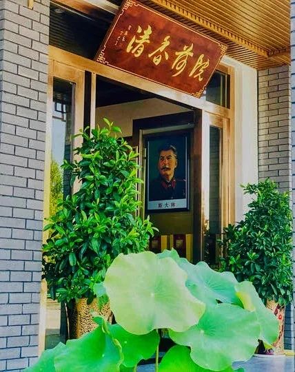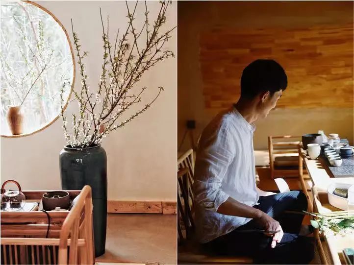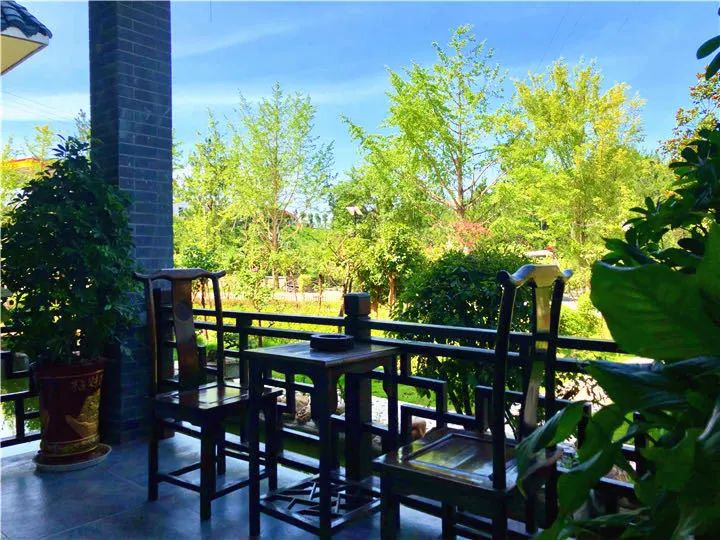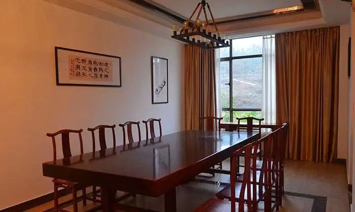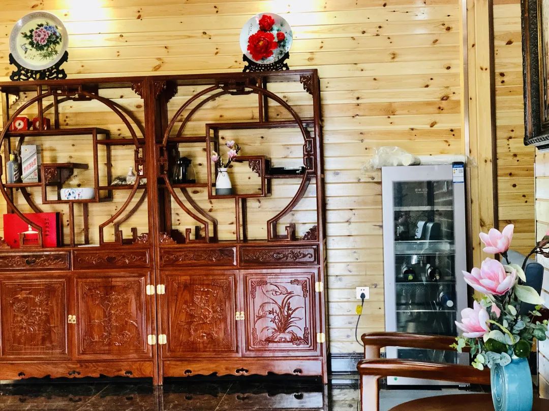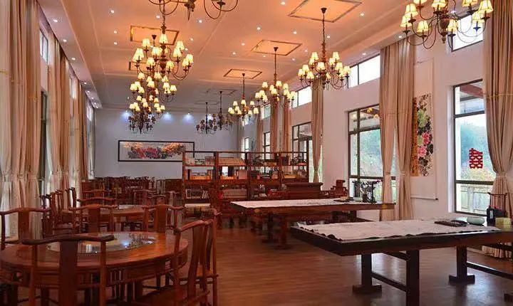 庄内的装饰是统一的新中式风格,实木桌椅、国画、书法,和着橘黄色的灯光,既有寻常百姓家庭的温馨,又有书香门第的雅致。