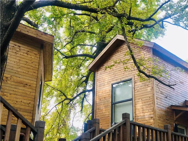 树屋均为木质构造,总计三间独栋客房,分布在古银杏的枝干间,以木质步道相通连。木屋内部宽敞通亮,独立卫浴、沙发配置齐全。