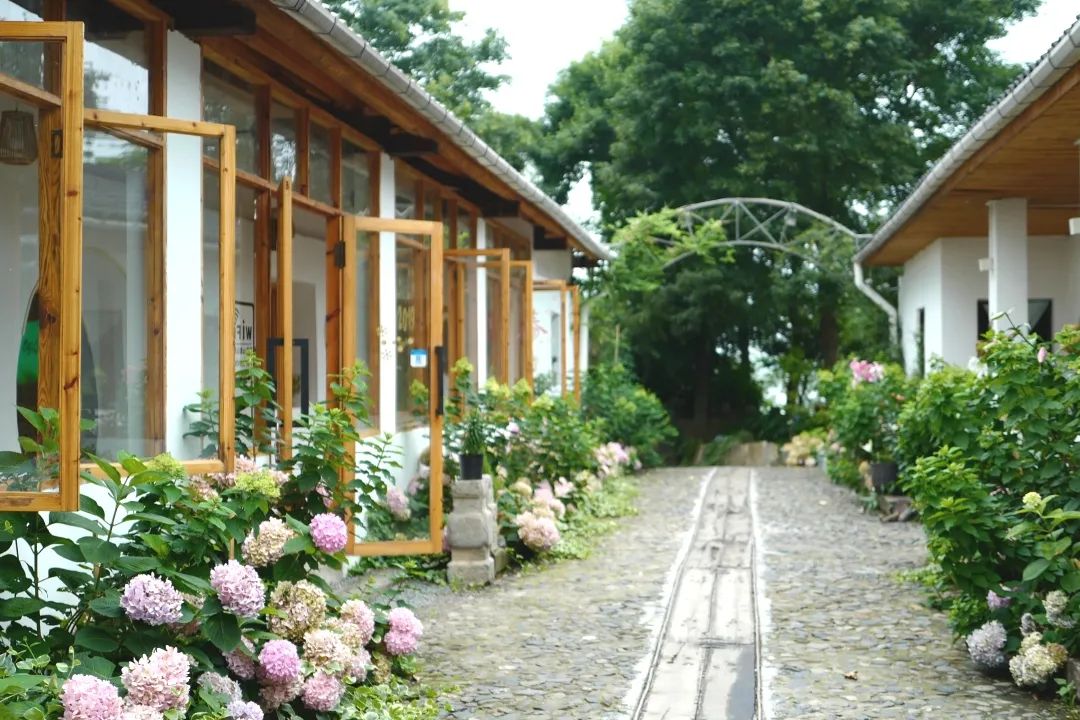 四处绿树成荫,屋前花开成片。远处,琵琶湖碧水悠悠,湖风吹着悦耳的风铃声响。山里附近有茶园,山里还有野果,餐桌上有最新鲜的山野美食。