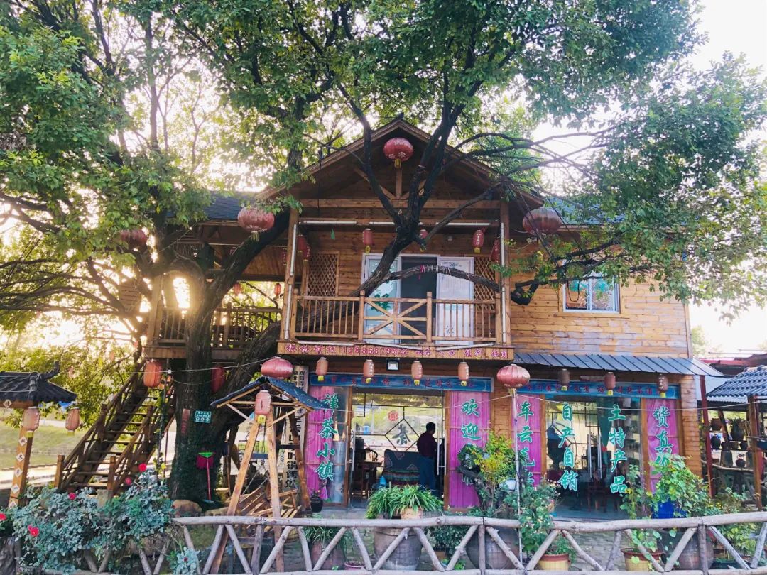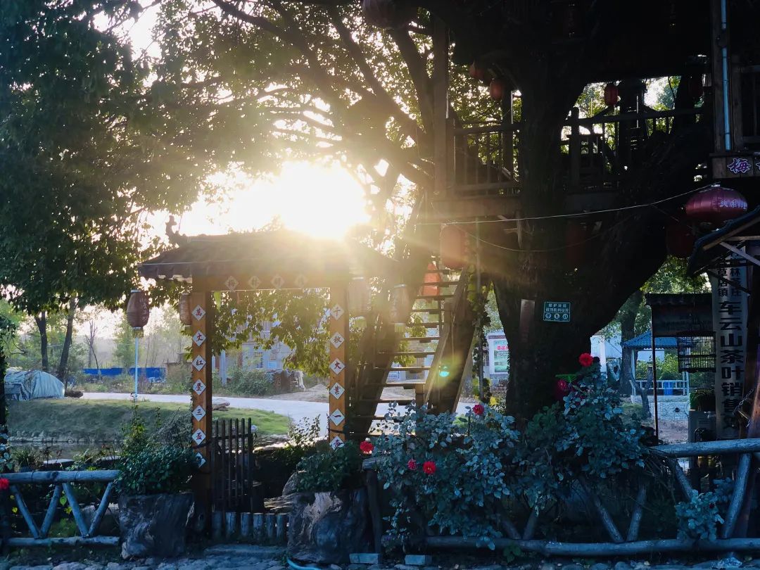 临河古树上的木屋,是让人一眼就心动的地方。古树葱郁,木屋精致,树下有一圈篱笆相围,与世隔绝,隐约之中可听见谈笑之声, 颇有古代驿站的氛围。
