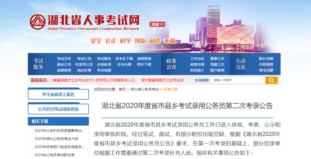 (三)第二次考录报名结束后,将在湖北省人事考试网发布全省第二次考录职位报名情况。各地公务员主管部门和招录机关按照报考人员公共科目笔试折算成绩从高分到低分的顺序进行资格审查。