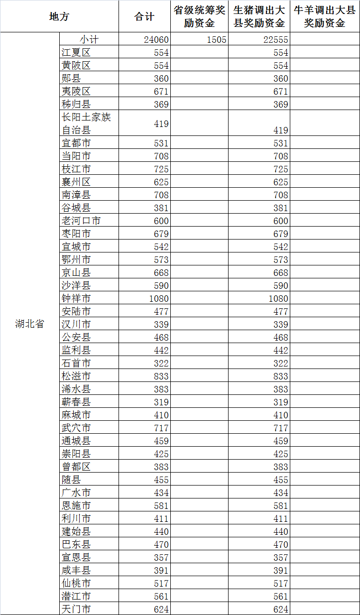 湖北省监利、南漳等43个生猪调出大县(市)将获得该项奖励资金2.26亿元。