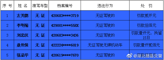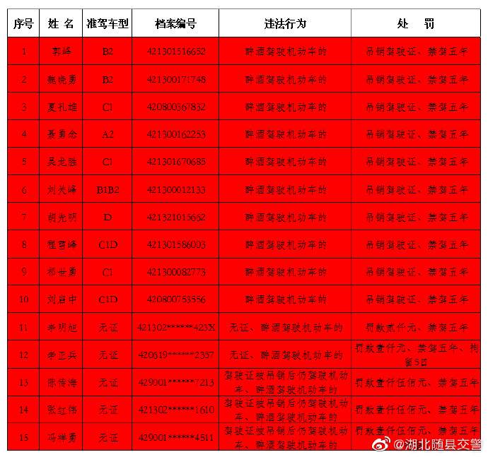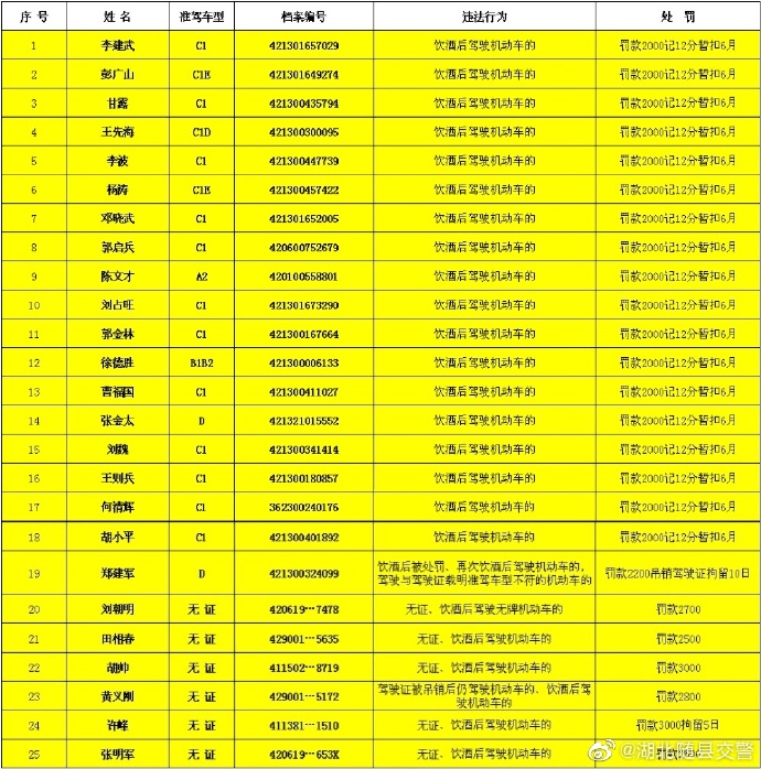 为进一步提升广大群众交通安全意识,有效震慑酒驾、醉驾、超载、无证驾驶等交通违法行为,现对随县11月份交通违法行为予以曝光,以此警示广大驾驶员自觉遵守交通安全法规。