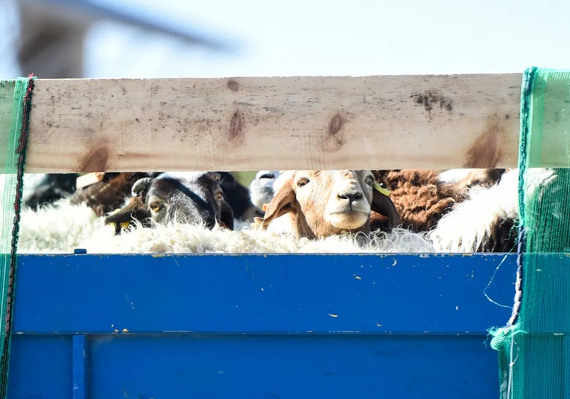 这是10月22日在内蒙古二连浩特口岸拍摄的蒙古国捐赠的羊。