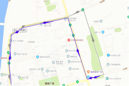 沿河道:程力水岸国际(沿河大道方向)→沿河大道北(沿河大道方向)→市检察院→市检察院南→北郊土管所→市委党校→市中医院→冷家湾→随州宾馆→市建委→玉石街口→曾都公安分局→张家台→一职中→客管处→金和弦琴行→中保公司西→市二中→聚奎门学校→鹿鹤市场→电信公司→购物中心→大十字街→圣宫饭店→烈山宾馆→北门口→金融大厦→五眼桥市场→曾都医院→五眼桥中学→交警二大队→明珠广场→明珠广场西→明珠小区→沿河大道北(烈山大道方向)→程力水岸国际南→程力水岸国际(烈山大道方向)