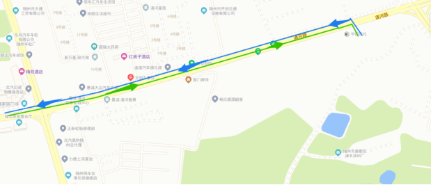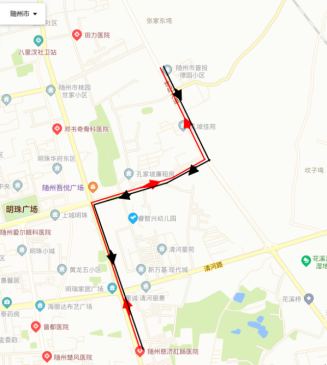 沿河道:吾悦广场→曾都消防→上农场(邓书奇骨科医院)→水岸国际二期→程力水岸国际(沿河大道方向)→沿河大道北(沿河大道方向)→市检察院→市检察院南→北郊土管所→市委党校→市中医院→冷家湾→随州宾馆→市建委→玉石街口→曾都公安分局→张家台→一职中→客管处→金和弦琴行→中保公司西→市二中→聚奎门学校→鹿鹤市场→电信公司→购物中心→大十字街→圣宫饭店→烈山宾馆→北门口→金融大厦→五眼桥市场→曾都医院→五眼桥中学→交警二大队→明珠广场→明珠广场西→明珠小区→沿河大道北(烈山大道方向)→程力水岸国际南→水岸国际→水岸国际二期→明珠一路北→明珠一路中→明珠一路南→明珠东路(吾悦广场)→吾悦广场