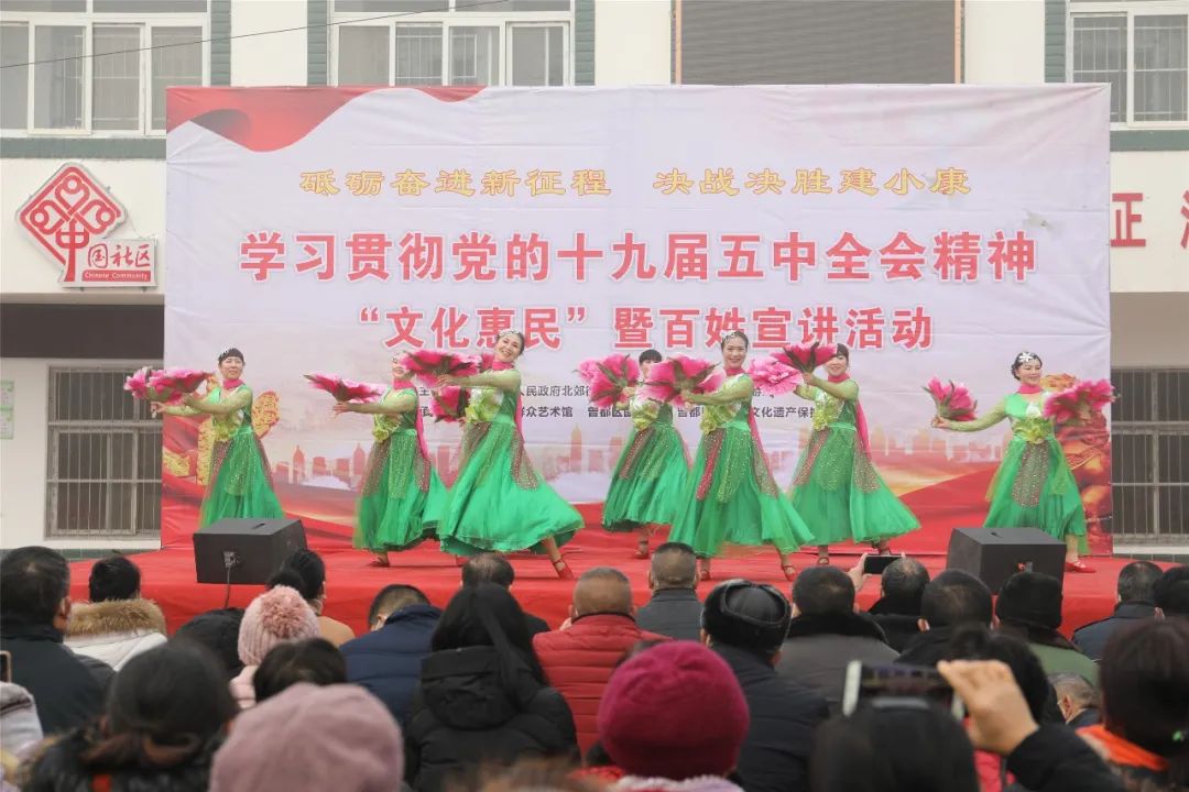活动在舞蹈《让中国更美丽》中拉开帷幕,女生二重唱《幸福山歌》、古典舞《丽人行》、女声小合唱《十送红军》、豫剧表演《咱们说说知心话》等精彩节目轮番上演,获得村民热烈掌声。“核心要义十三新、强国富民是根本、不忘初心担使命,为人民。”区群艺馆自编自导的三句半《五中全会精神赞》更是将现场气氛推向高潮。村民张春燕表示:“这场表演我们看的起劲,宣讲接地气,我们听得懂也记得住。”