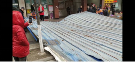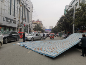 当日上午十一时许,街面巡逻的民警刘昭和邱朝阳行至东大街附近,看见整条东大街不知何因被车辆堵的水泄不通,人群聚集着相互抱怨。见状后,民警邱朝阳带领同事张阳、熊英步行沿路查看了解发现位于东大街劳动就业局对面一私人楼顶自建的钢构遮雨棚(有五六十平方大小重达两三百斤)被大风从六楼顶吹下来砸到路边车辆,诺大的钢构遮雨棚掉在地上挡住了车辆来往的通道。