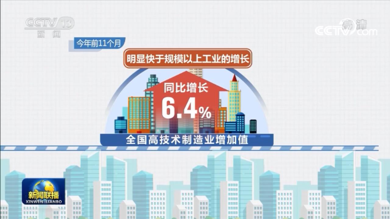 数字技术强势崛起,加速与产业融合。今年前11个月,全国高技术制造业增加值同比增长6.4%,明显快于规模以上工业的增长,高技术产业投资同比增长11.8%,继续保持较快增长。