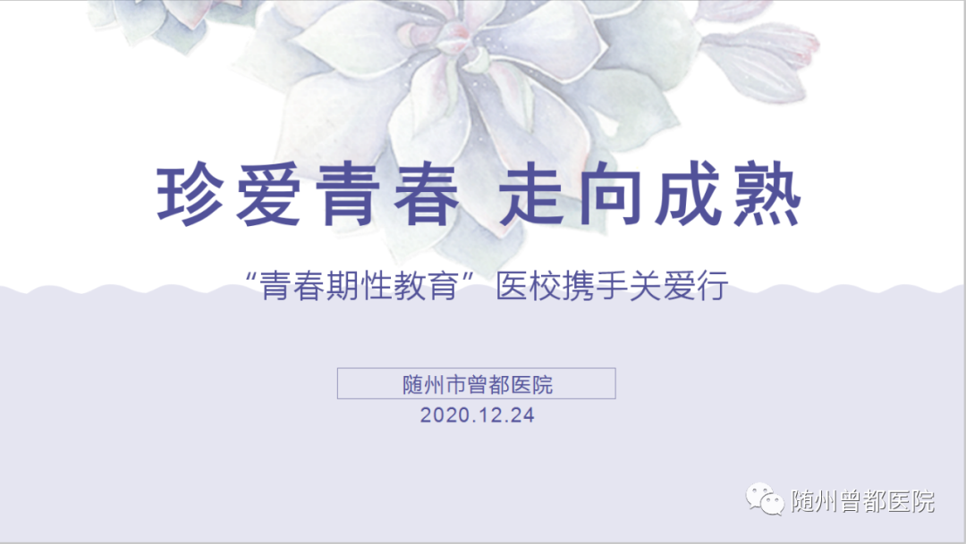 2020年12月24日下午两点,随州市曾都医院康庆莉医师、徐华兵医师应邀到曾都一中,为该校2000多名学生进行了以青春期性教育为主题的“珍爱青春、走向成熟”专题讲座。