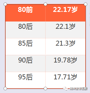 80前的初次「为爱鼓掌」发生年龄平均在22.17岁,而95后「为爱鼓掌」发生年龄平均在17.71岁,初次的年龄提前了4.46岁。