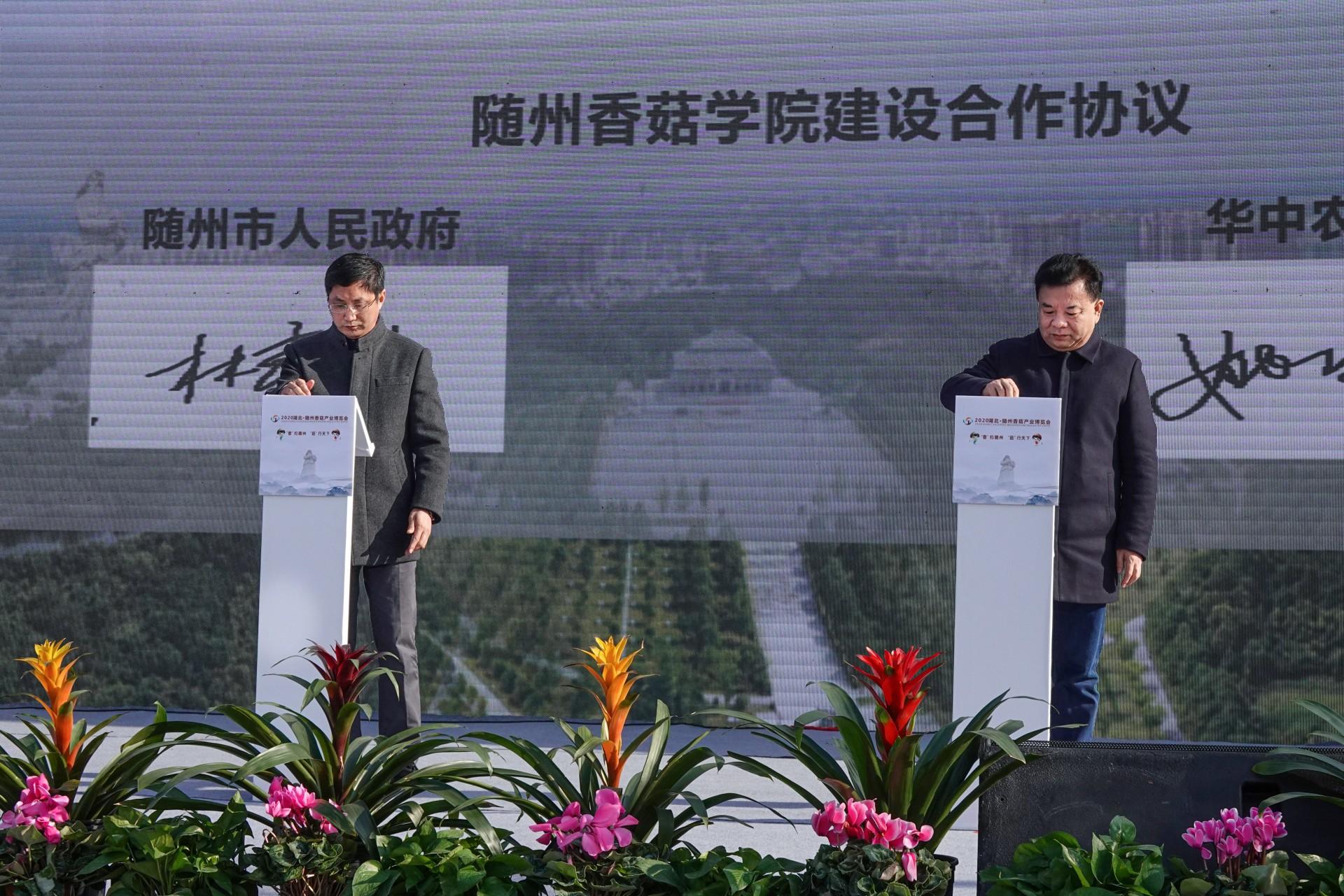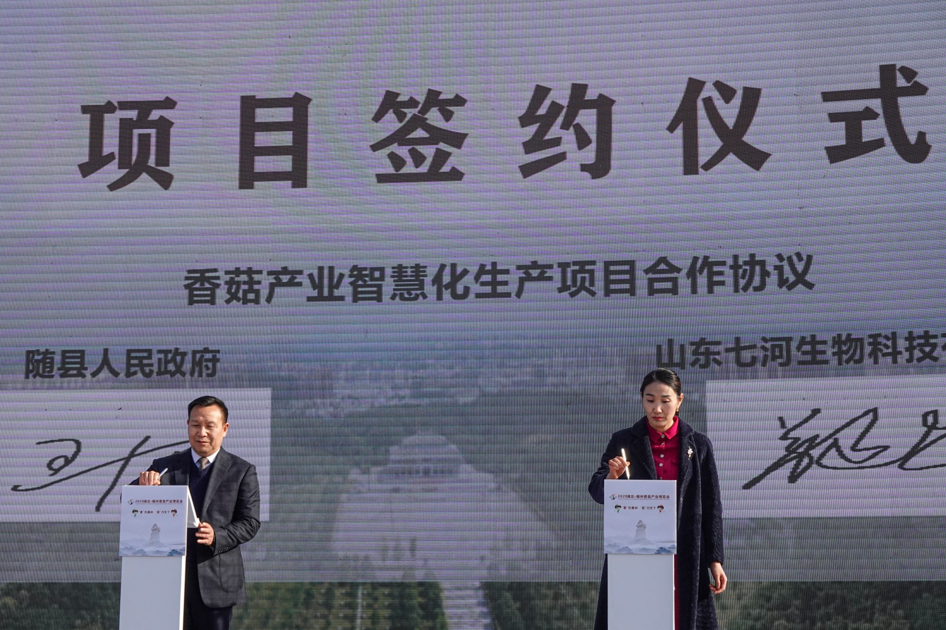 开幕式上,还举行了“随州香菇”国家地理标志证明商标奖牌、国家农产品地理标志登记证书奖牌授牌仪式。市政府和华中农业大学签订了随州香菇学院战略合作协议。23个项目集中签约,涉及菌种研发、规模种植、精深加工、机械制造等领域,预计投资额超过30余亿元,其中,随县与山东七河生物科技有限公司签约的香菇菌棒智慧化工厂生产项目投资9.5亿元,将建成年产5000万棒香菇菌棒的智慧化工厂生产基地和标准化种植基地。