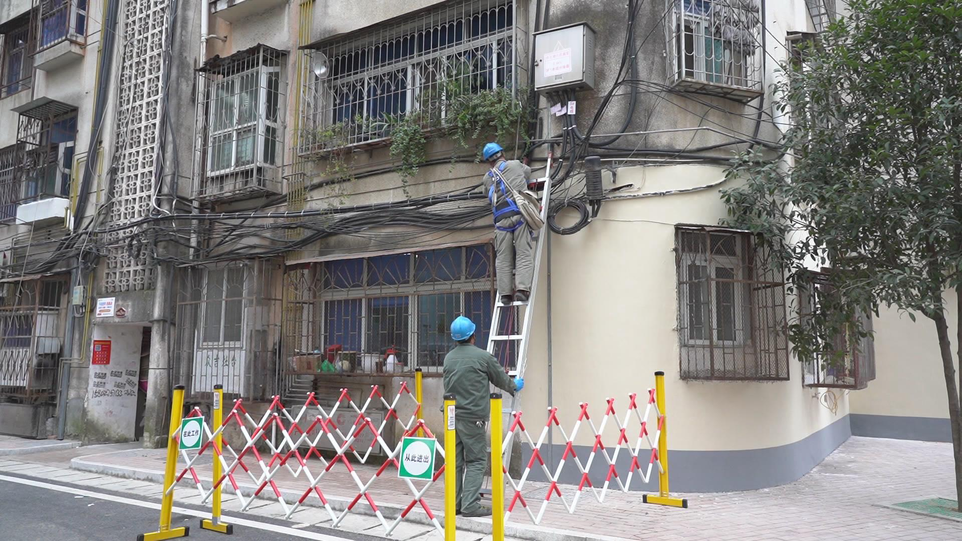 在位于白云湖小区的施工现场,记者看到,工作人员设置了安防防护围栏,身上系着安全绳,借助梯子进行电缆线的铺设、安装等工作。该小区属于老旧小区,管线结构较为复杂,给工作人员的施工带来了一定的难度,为了确保电改工作顺利进行,每一步都不能马虎。