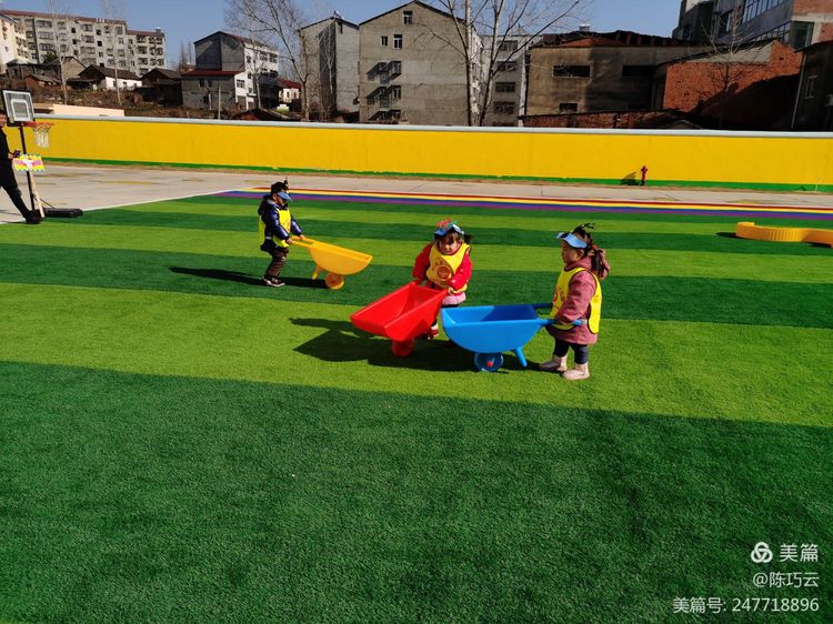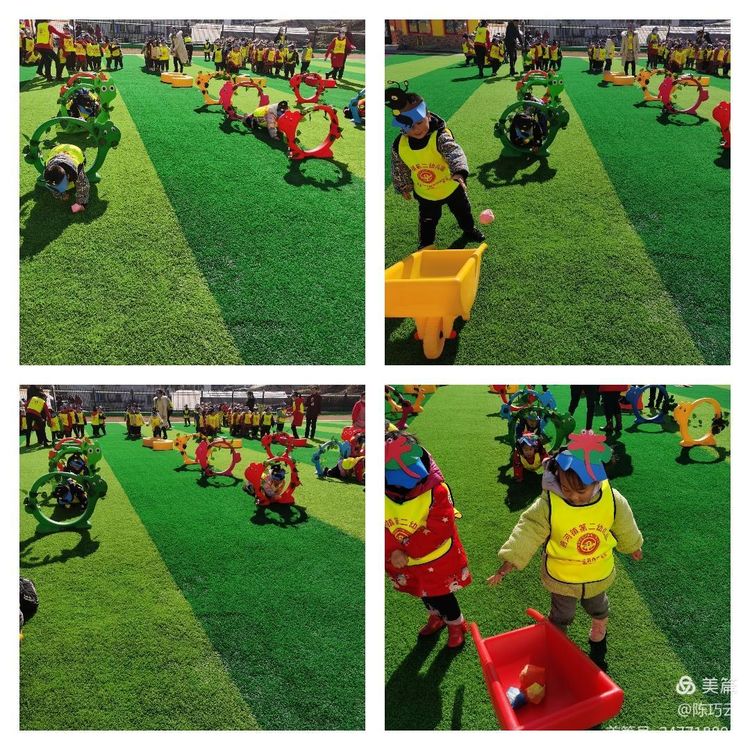 《小猴运水果》:在这个游戏中所用到的道具独轮车,能在锻炼孩子奔跑、快走的同时,提高孩子们身体平衡协调的能力。