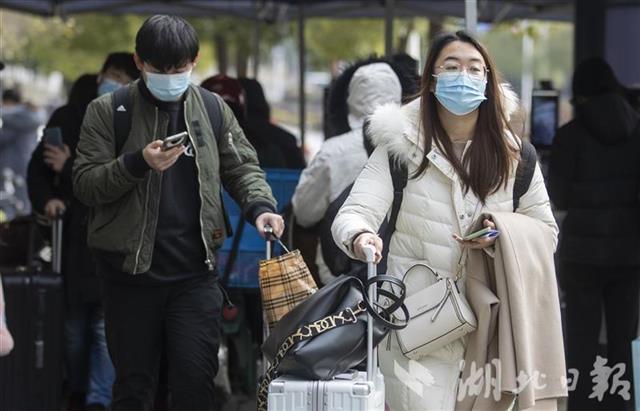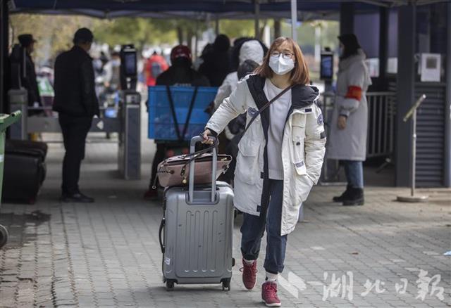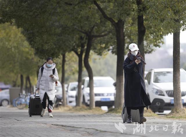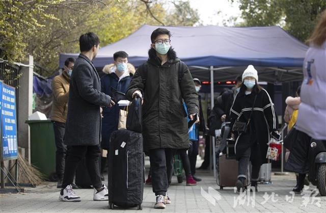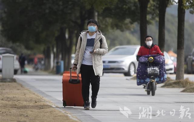1月10日,华中农业大学校门口,放假离校的大学生戴着口罩、拖着行李箱走出校园。近日,武汉不少高校提前进入“寒假模式”,大学生们开始有序、错峰离校。离校前,各高校普遍温馨提醒和强调,引导学生做好返乡途中的个人防护和居家期间疫情防控,确保安全出行、顺利返家。