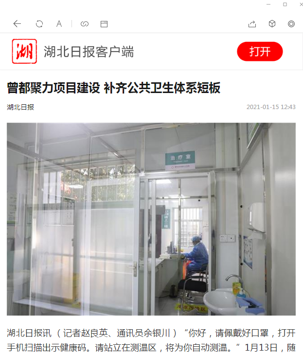 2020年,曾都区深入实施健康共创示范行动,围绕疾病预防控制体系、医疗救治体系、基层防控体系、院前急救体系和重大疫情信息平台建设,努力补齐公共卫生体系短板。目前,8个镇级卫生院发热门诊改造完成并投入使用,投资3.6亿元的曾都医院门诊综合楼正加紧建设。