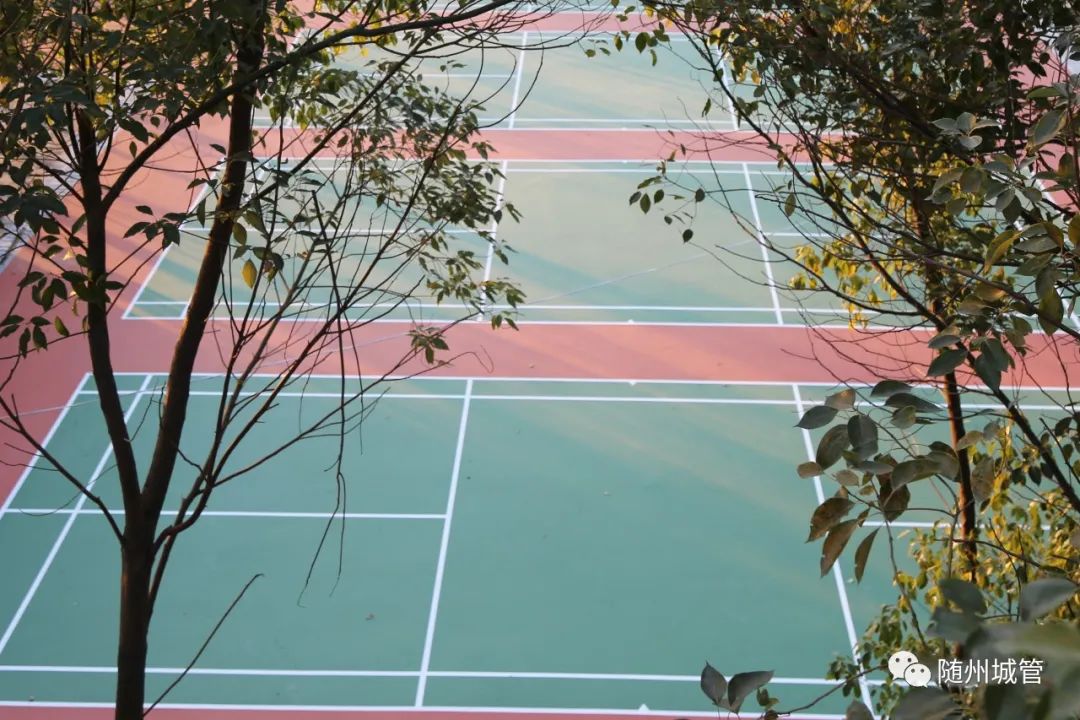 “富氧康体”基本建成。蓝色的主体道路与周围的花树交相辉映,各式各样的健身器材已经安装完毕,其中篮球场、羽毛球场已经建成。