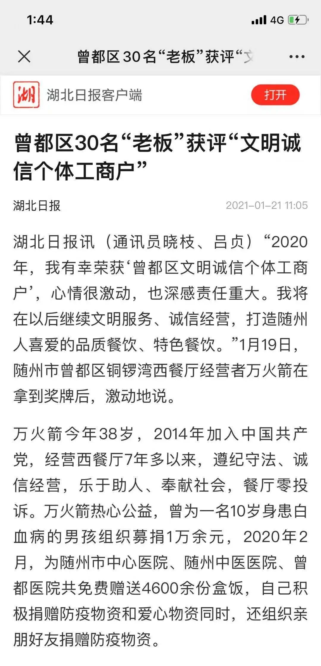 万火箭今年38岁,2014年加入中国共产党,经营西餐厅7年多以来,遵纪守法、诚信经营,乐于助人、奉献社会,餐厅零投诉。万火箭热心公益,曾为一名10岁身患白血病的男孩组织募捐1万余元,2020年2月,为随州市中心医院、随州中医医院、曾都医院共免费赠送4600余份盒饭,自己积极捐赠防疫物资和爱心物资同时,还组织亲朋好友捐赠防疫物资。