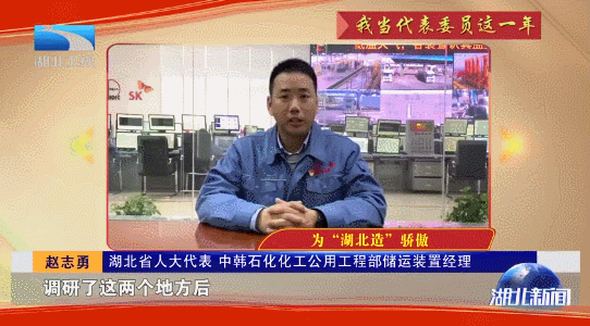 省人大代表、中韩石化化工公用工程部储运装置经理赵志勇:“我是中韩石化的赵志勇,是一名来自化工企业的基层代表。过去的一年,我关注了生态环保、司法公正,省市在建和已建成的重点项目等情况,其中印象最深的是调研青山长江大桥和地铁五号线,五号线地铁从启动到驾驶、停车、 检测全部自动完成。代表了国内先进智能列车的最高水平,全部为‘武汉造’,调研了这两个地方后,我为我们湖北武汉的制造业感到骄傲和自豪。”