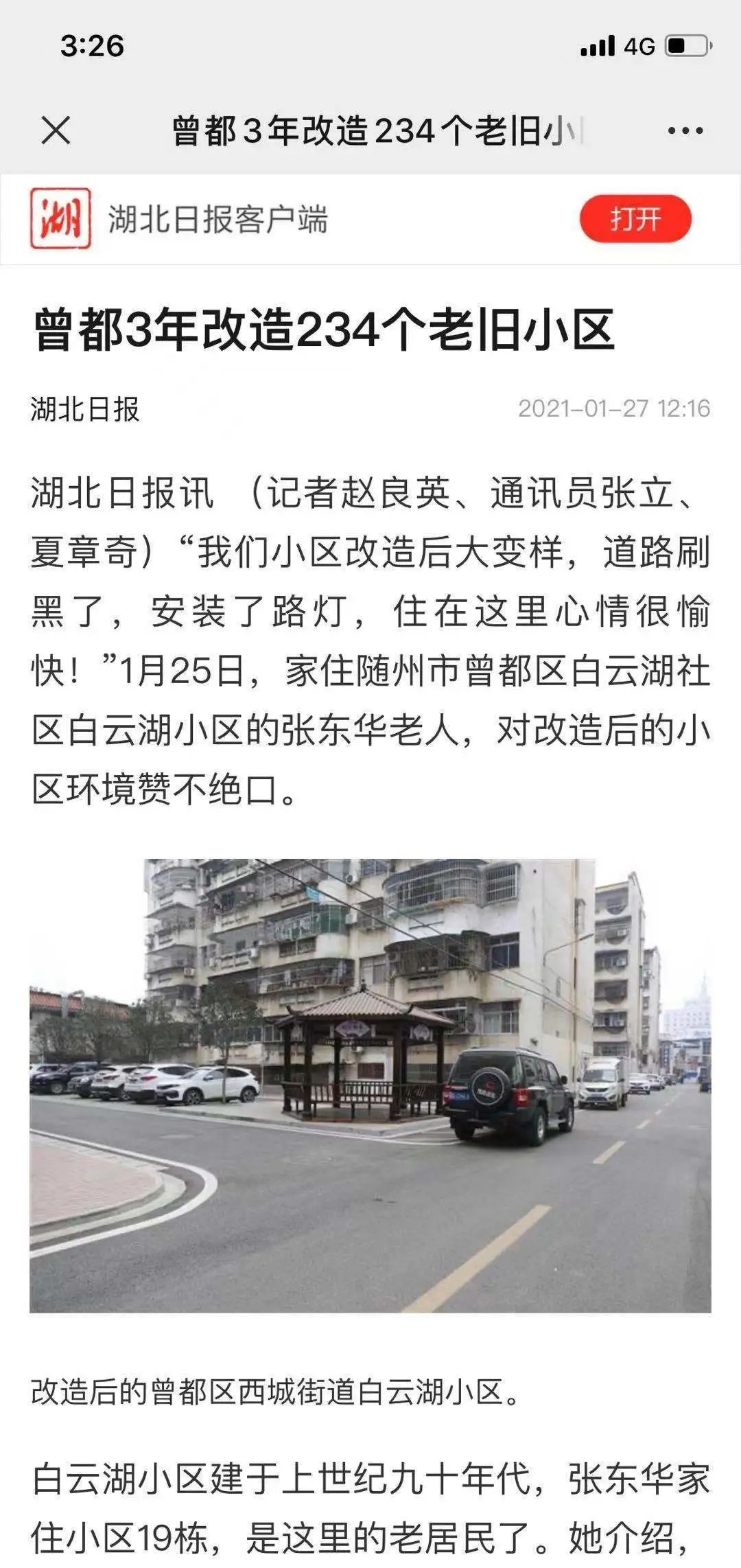 2019年,曾都区启动老旧小区改造,计划投资3.2亿元,2019年和2020年完成中心城区75个老旧小区改造项目,涉及1.6万户、581栋房屋,改造面积约167.7万平方米。白云湖小区是第一批改造的老旧小区,重点解决雨污分流、水电到户、停车难、安防、消防等问题。