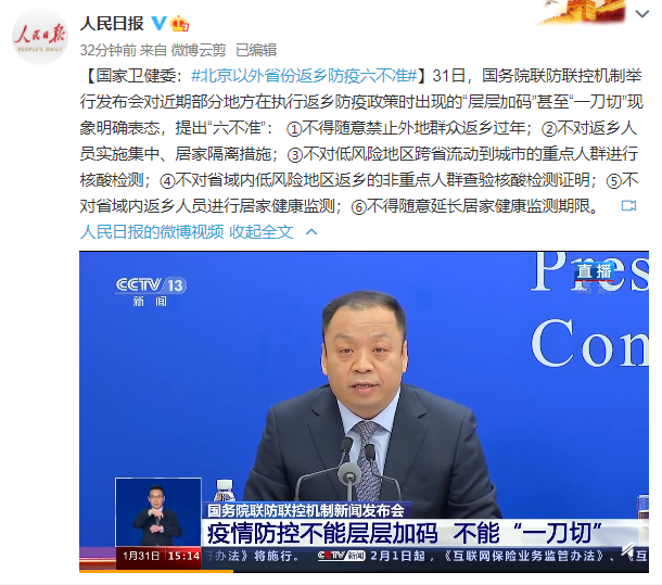国务院联防联控机制1月31日举行新闻发布会对近期部分地方在执行返乡防疫政策时出现的“层层加码”甚至“一刀切”现象明确表态,这既是一种“懒政”,也是对宝贵防疫资源的浪费。对明显违反返乡加码“六不准”的地方,国务院联防联控机制综合组将予以通报,要求立即整改。