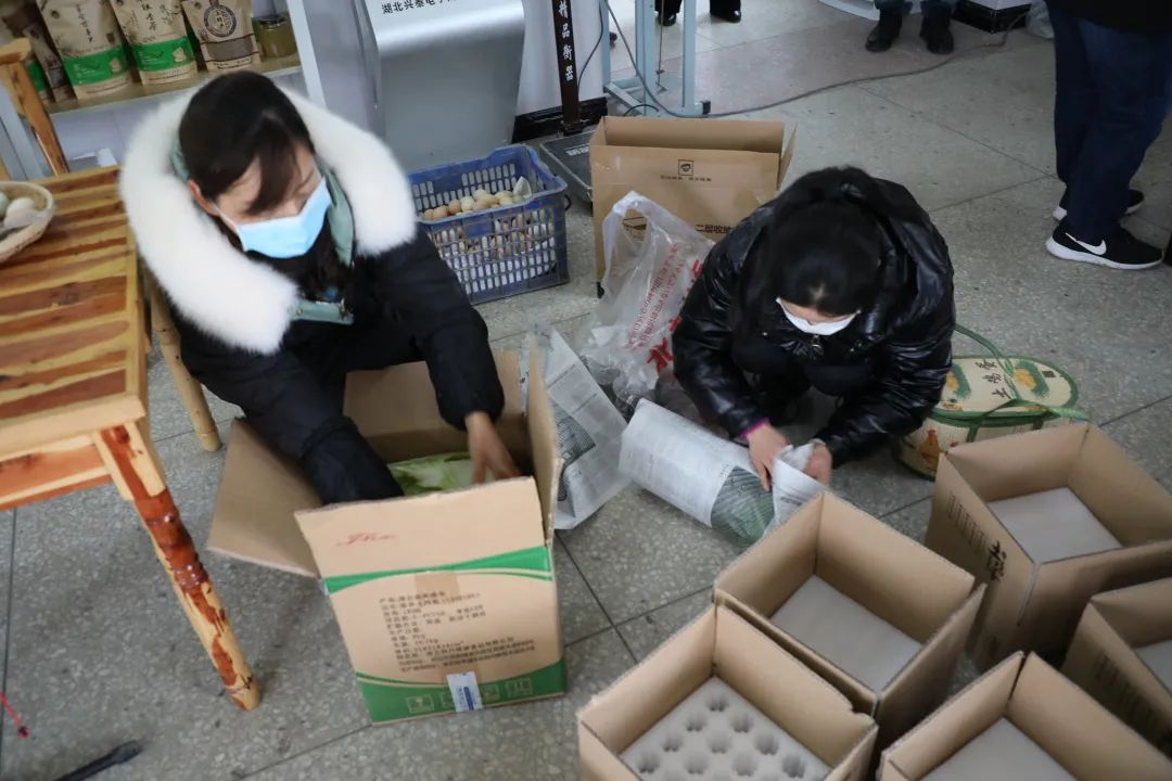 “这些都是老乡们通过微信下单的产品,我们今天将打包发出去。”洛阳镇珠宝山村党支部书记杨忠平介绍道。“受疫情影响,我们有300余名村民选择就地过年,我们依托村级电商服务站,销售村民自产的年货,希望能让在异地过年的父老乡亲们品尝到家乡的年味,过个好年。”