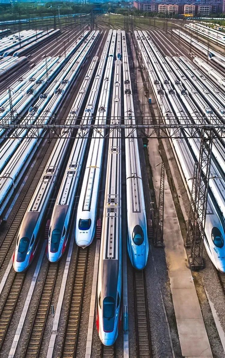 长江日报资料图:武汉动车段近百组动车组整齐停放,蓄势待发。
