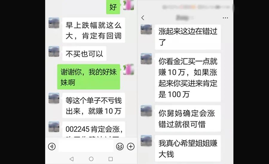 (图片来源网络)荐股群一般分两种:一种是卖软件、服务(VIP);花的钱越多,得到的“服务”更好,殊不知,他们每天晒的“盈利”,都是自己做的截图而已,利用的就是人们的贪欲,这种还算有点“良心”。损失一般不会太大。第二种就可恶了!今天就详细说说第二种!第二种!这些诈骗团伙分工明确且各司其职,大致分为三部分:1、推荐股票的“大师”这些“大师”一般都是被聘请的,因为他们需要掌握部分真正的技术,起码够忽悠大部分投资人才行,有的只是涉猎股市的门外汉。在整个过程中起着主导作用,而各类荐股群就是他们日常表演的舞台。主要作用:负责直接对股民进行洗脑;推荐投资产品。2、专门负责联系的“老师”(助理)这里说的“老师”(助理)就是与平时联系并指导你的那个人,相同的“老师”(助理)可能同时存在几个、十几个甚至更多分布在不同的群里,他们的语言带有煽动性,在群里的互动更是极具迷惑性,既能神华“大师”的水平,又能刺激投资者跟风买股,制造多赚少赔的假象!主要作用:搞接待,做服务,带节奏。3、群中的“活跃分子”一般都是通过统一培训,掌握一定心理窥探技术;善于伪装(往往伪装成帅哥美女)针对对象不同伪装也不同,甚至有些伪装成已婚男女,摇身一变成股友跟你患难与共,每天跟你聊天最多,取得你的信任感并探出你资金、家庭、生活的方方面面,最后目的不言而喻。主要作用:烘托氛围,了解股民心理,促成最终目的!