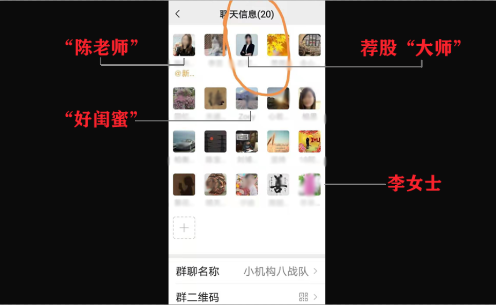 (图为受害人提供)对此一窍不通的李大姐仿佛看到了翻身的机会!“陈老师”把李大姐拉进了一个“小机构八战队”的微信群,群内共20人,发现好闺蜜“张若依”也在群里。