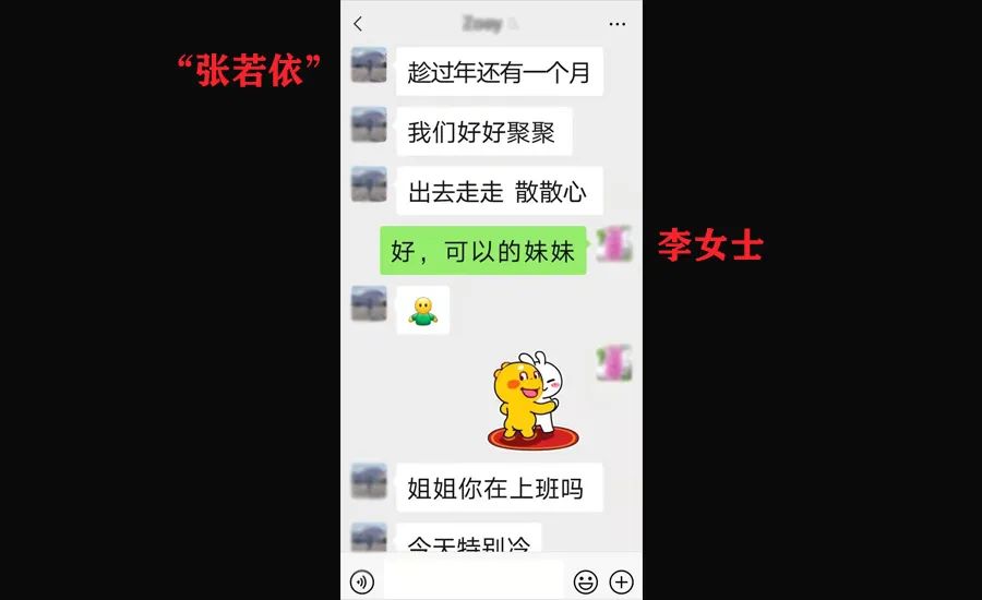 2020年1月7日。李大姐添加了一个微信好友,“张若依”。起初,李大姐并不想理会她。后来,在一个时间点,两人聊了起来。慢慢的从偶尔聊聊到无话不说,小到吃饭睡觉,大到国际形势。形影不离,惺惺相惜,俨然成了一对“好闺蜜”。