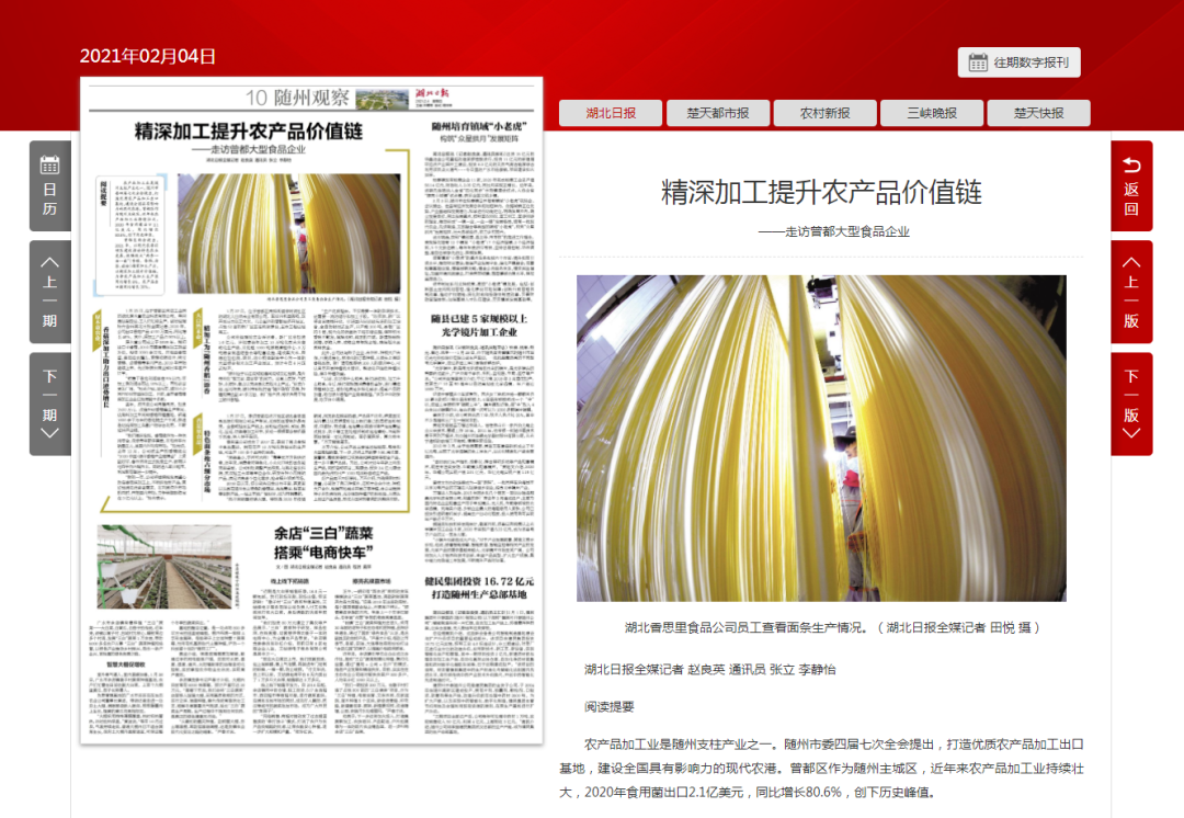 曾都区两会提出,2021年,以现代农港引领区建设推动特色农业发展,做强做大“两香一油一面”(香菇、香稻、油茶、面粉)精深加工产业,以精深加工提升价值链,力争农产品加工业产值同比增长8%,农产品出口额同比增长30%。