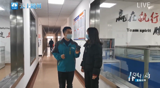 图为电视台记者正在齐星公司现场讲解招聘岗位