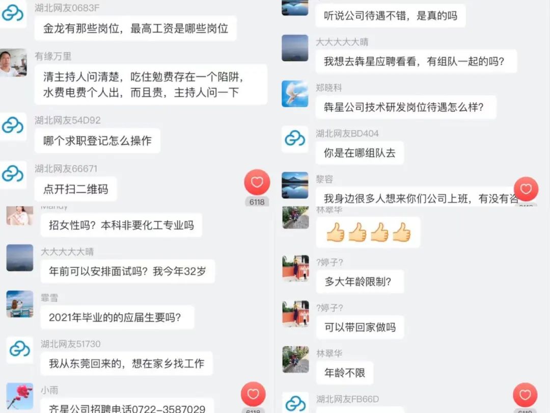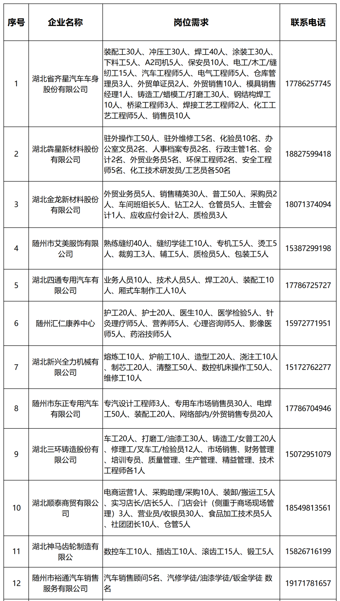 首场直播活动中,齐星公司、湖北犇星、金龙公司、艾美服饰、四通汽车5家重点企业参与,提供涉及汽车机械、纺织服装、商贸服务、交通运输等600多个岗位。