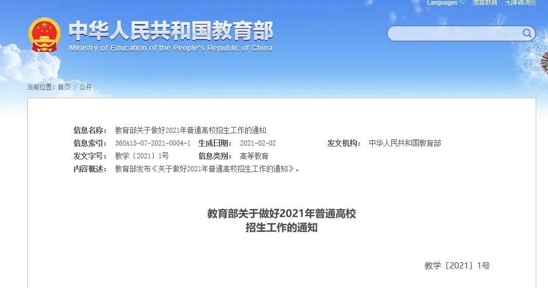 同时,“教育部关于做好2021年普通高校招生工作的通知”对各地各校招生工作做出明确规定。