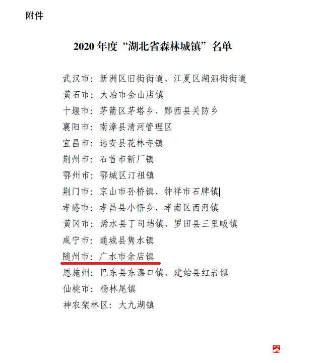 近日,湖北省绿化委员会、湖北省林业局授予全省21个乡镇“湖北省森林城镇”称号,广水市余店镇光荣入选。至此,广水市先后共有5个乡镇入选“湖北省森林城镇”称号,分别是武胜关镇、长岭镇、马坪镇、郝店镇、余店镇。