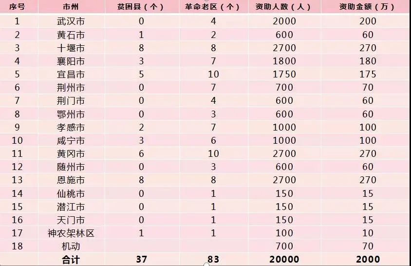 根据腾讯公益慈善基金会“春暖行动”项目投放要求,重点向大别山、武陵山、秦巴山、幕阜山等地区脱贫摘帽县和革命老区县倾斜。