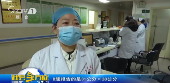 【采访】曾都医院妇产科 主任 胡春芹:当时发现她的盆腔有一个巨大的包块,B超报告的是31公分×28公分,像这种腹腔长包块儿的很多见,但是长这么大的肿瘤的不多见,我们在临床上见得比较少。