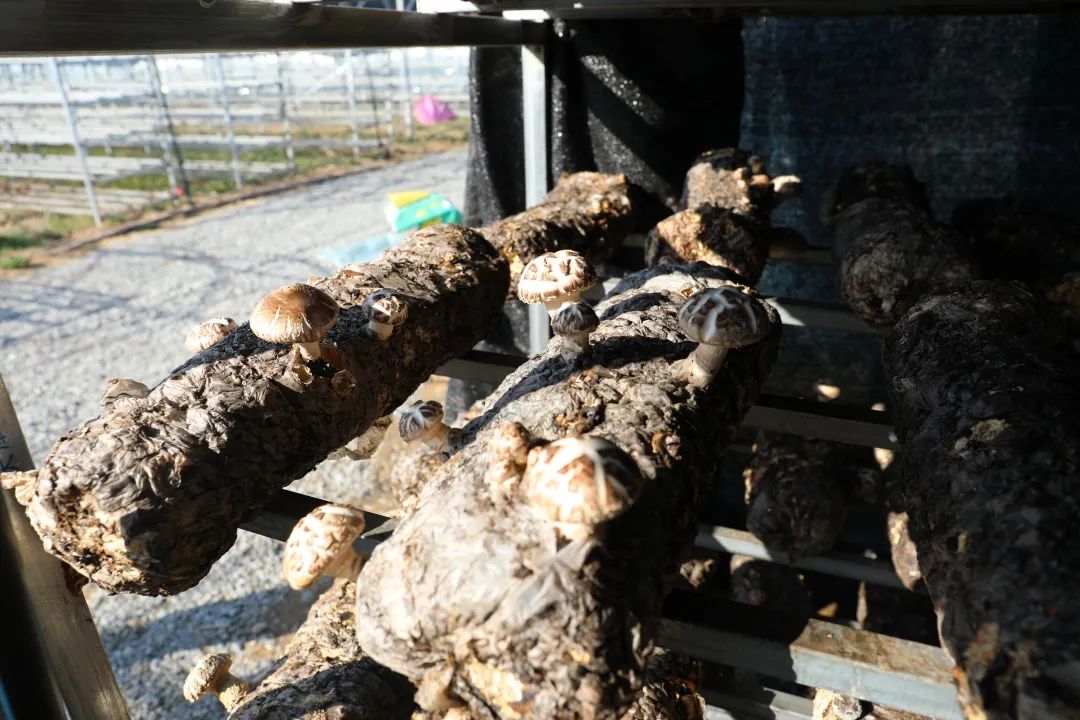 跟随着孟余刚的脚步,映入眼帘的是,白色的塑料膜被一根根拱形的钢架支撑,塑料膜上被一层黑色的遮阳网所覆盖而成的菇棚。棚内银白的钢架上密密麻麻的水平横向排列着褐色的菇棒,与菇棒相连接的是雪白色伞柄,伞柄上一朵朵褐色的伞顶向上舒展,不断张开继而被撑破,褐色白色的花纹相互交错却不觉杂乱。