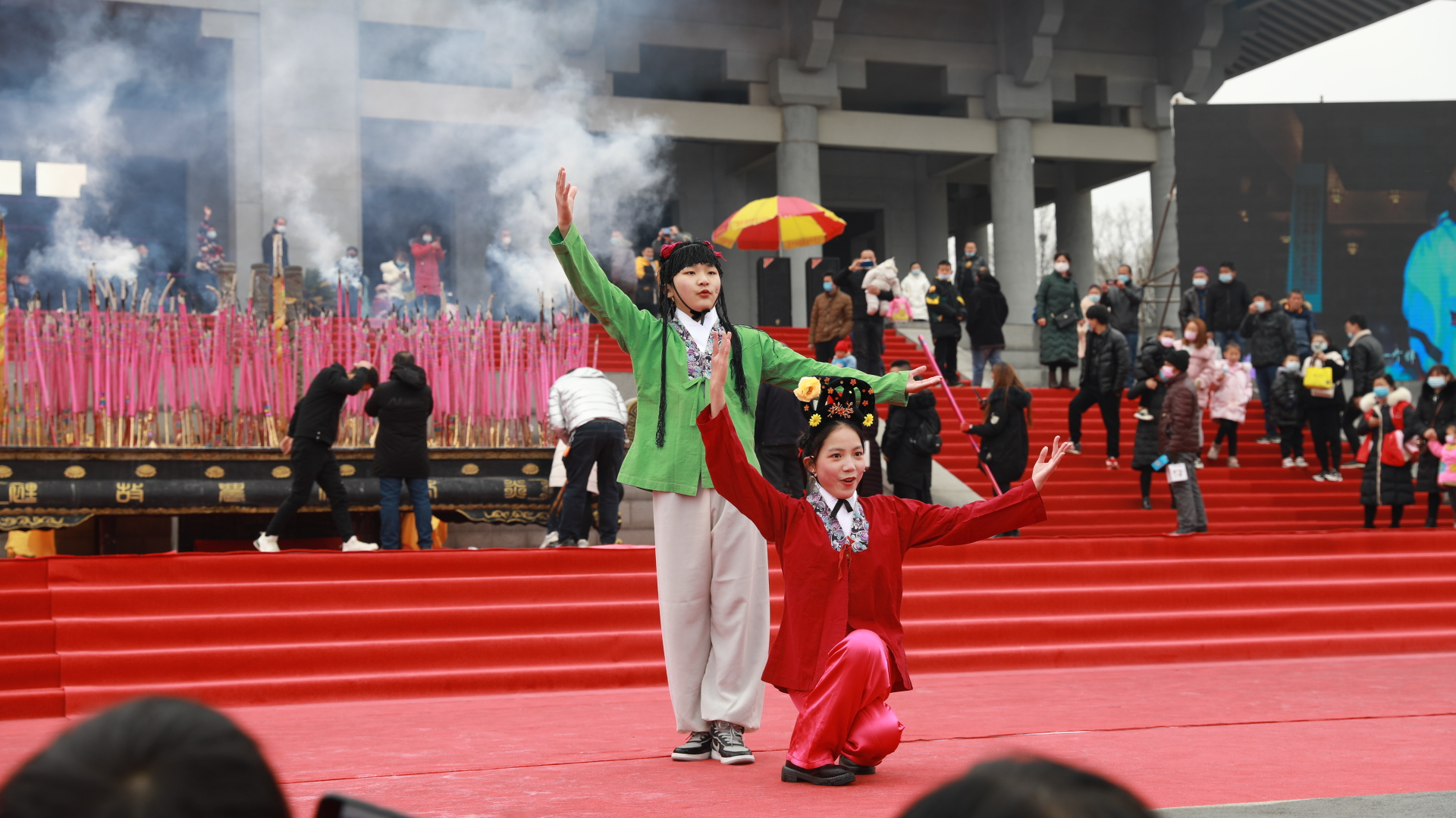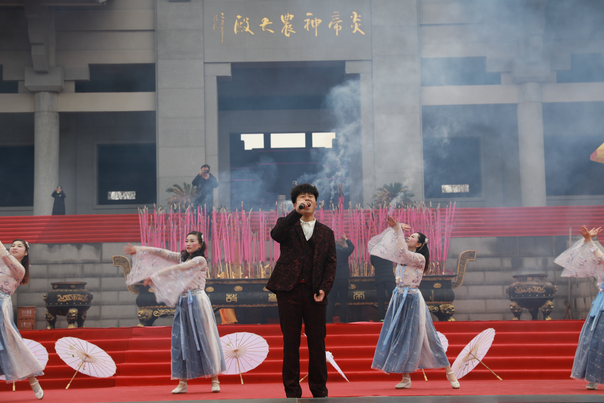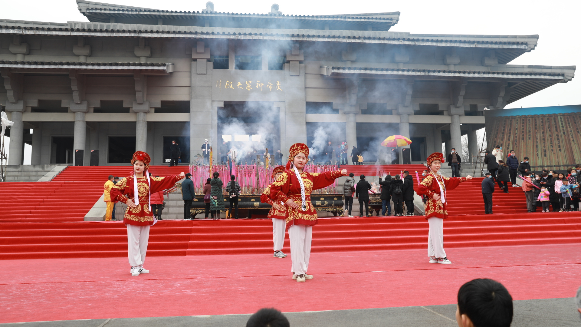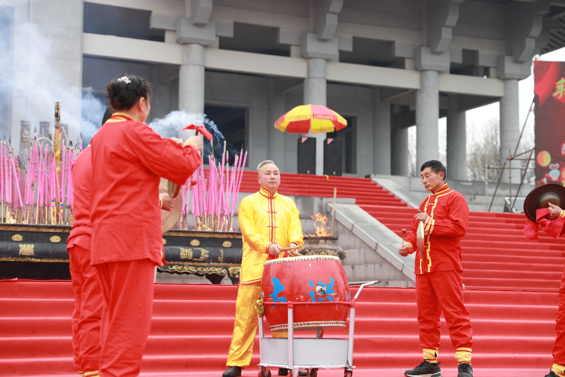 演职人员击鼓鸣钟、供奉贡品、乐舞献礼,