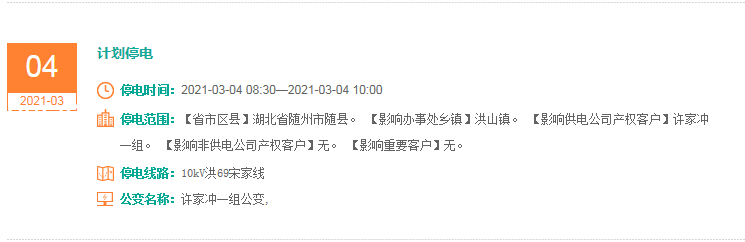 停电范围:【省市区县】湖北省随州市随县。【影响办事处乡镇】洪山镇。【影响供电公司产权客户】许家冲一组。【影响非供电公司产权客户】无。【影响重要客户】无。